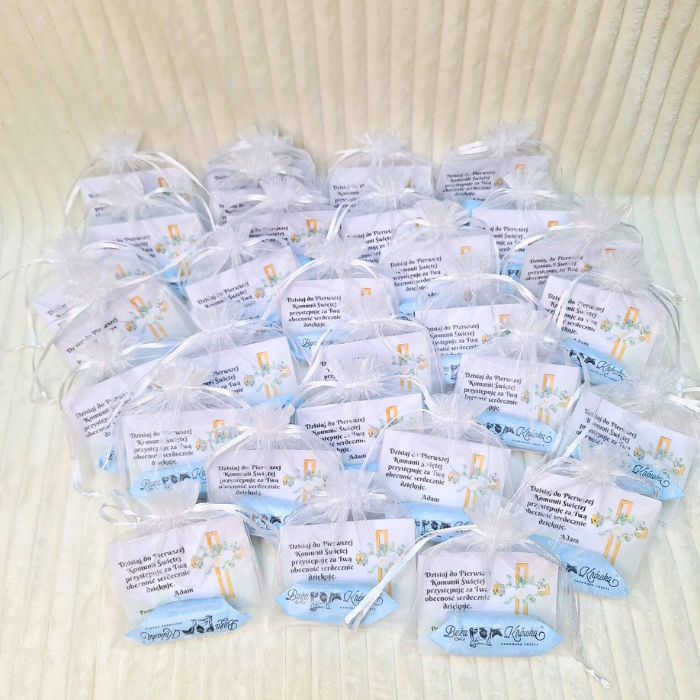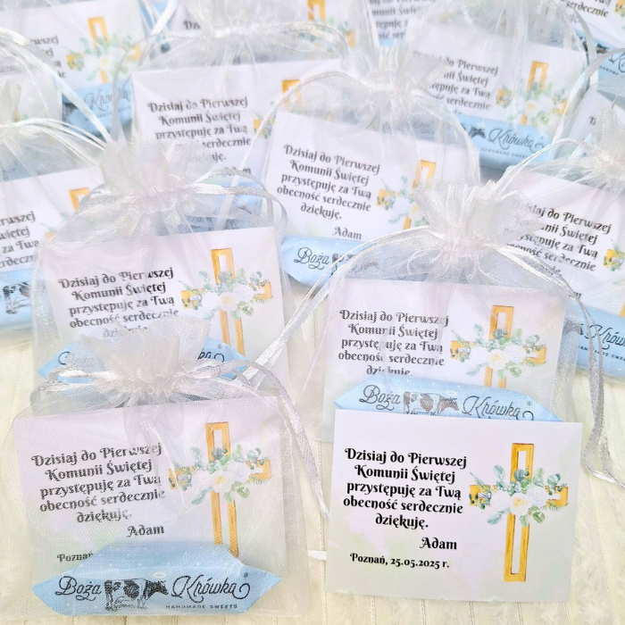 Każde podziękowanie tworzone jest z najwyższą starannością. W środku eleganckiego woreczka z organzy znajduje się personalizowana karteczka z imieniem dziecka i datą uroczystości, a także wyjątkowy cukierek – Boża Krówka. W jej wnętrzu ukryta jest sentencja o tematyce komunijnej, dzięki czemu upominek nabiera jeszcze głębszego znaczenia.