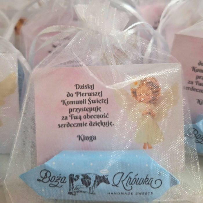 Podziękowanie komunijne z krówką – woreczek z organzy, spersonalizowana karteczka i cukierek z sentencją. Idealny upominek dla gości Komunii Świętej.